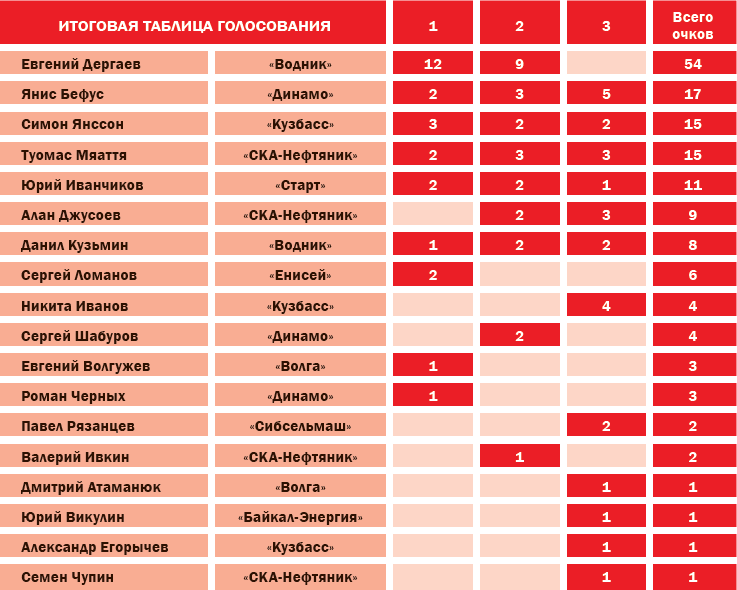 Полную и подробную (с индивидуальным выбором респондентов) таблицу голосования ищите в апрельском номере журнала «Русский хоккей»!