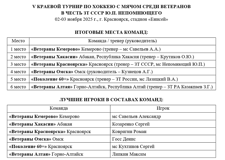 2−3 ноября 2025 года в ледовой арене «Енисей» прошел традиционный V Межрегиональный турнир по хоккею с мячом среди ветеранов в честь заслуженного тренера СССР Ю.П.Непомнющего.