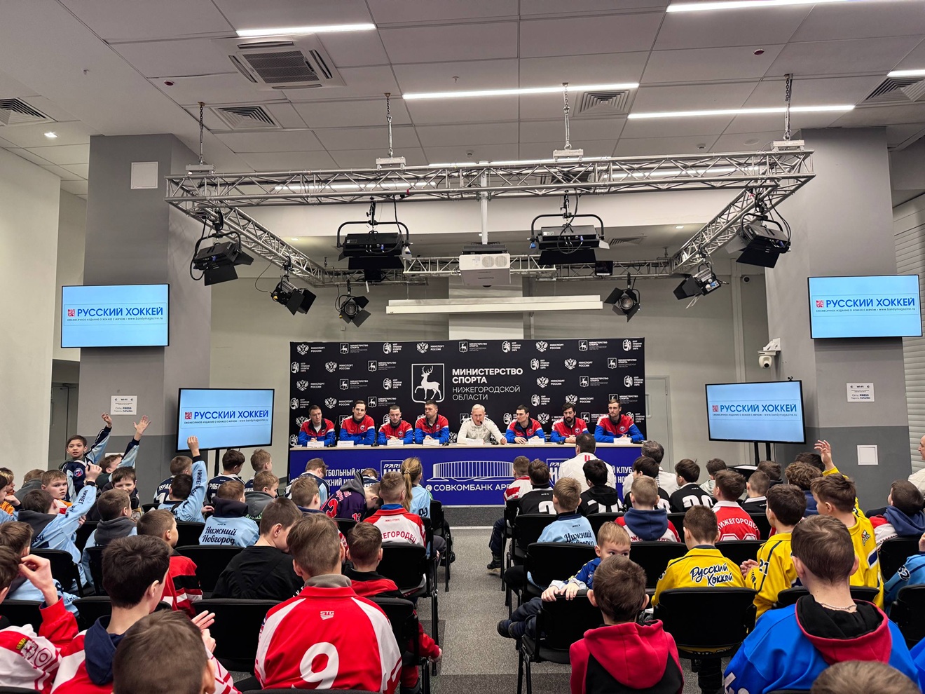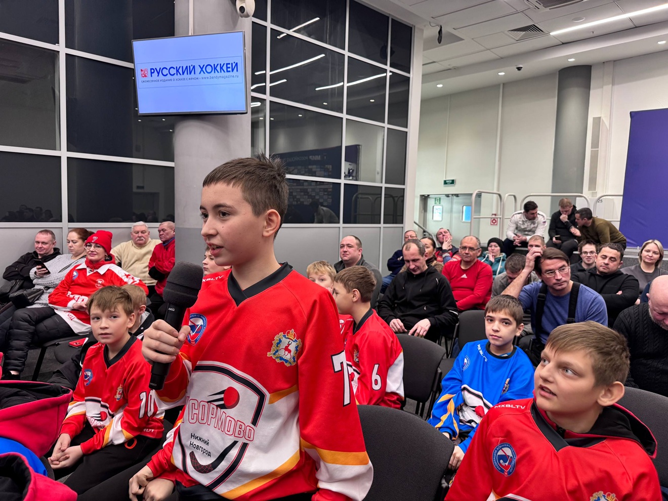 Блиц получился необычным, ведь свои вопросы чемпионам мира и сильнейшим игрокам страны задавали совсем юные интервьюеры — спортсмены хоккейных школ Нижегородской области.