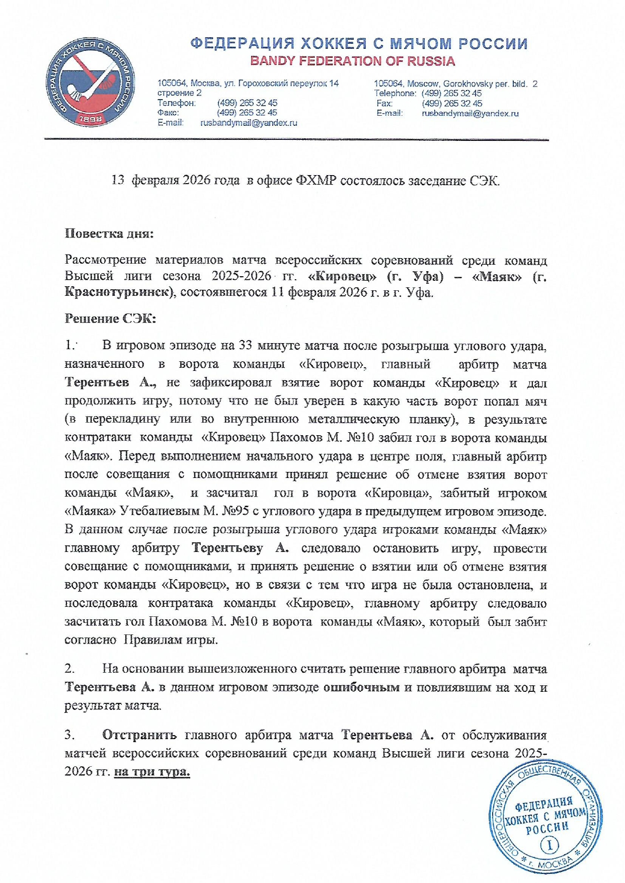 В пятницу, 13 февраля, состоялось заседание Судейско-экспертной комиссии (СЭК) по матчу Высшей лиги 2025/26 годов, состоявшемуся в Уфе.