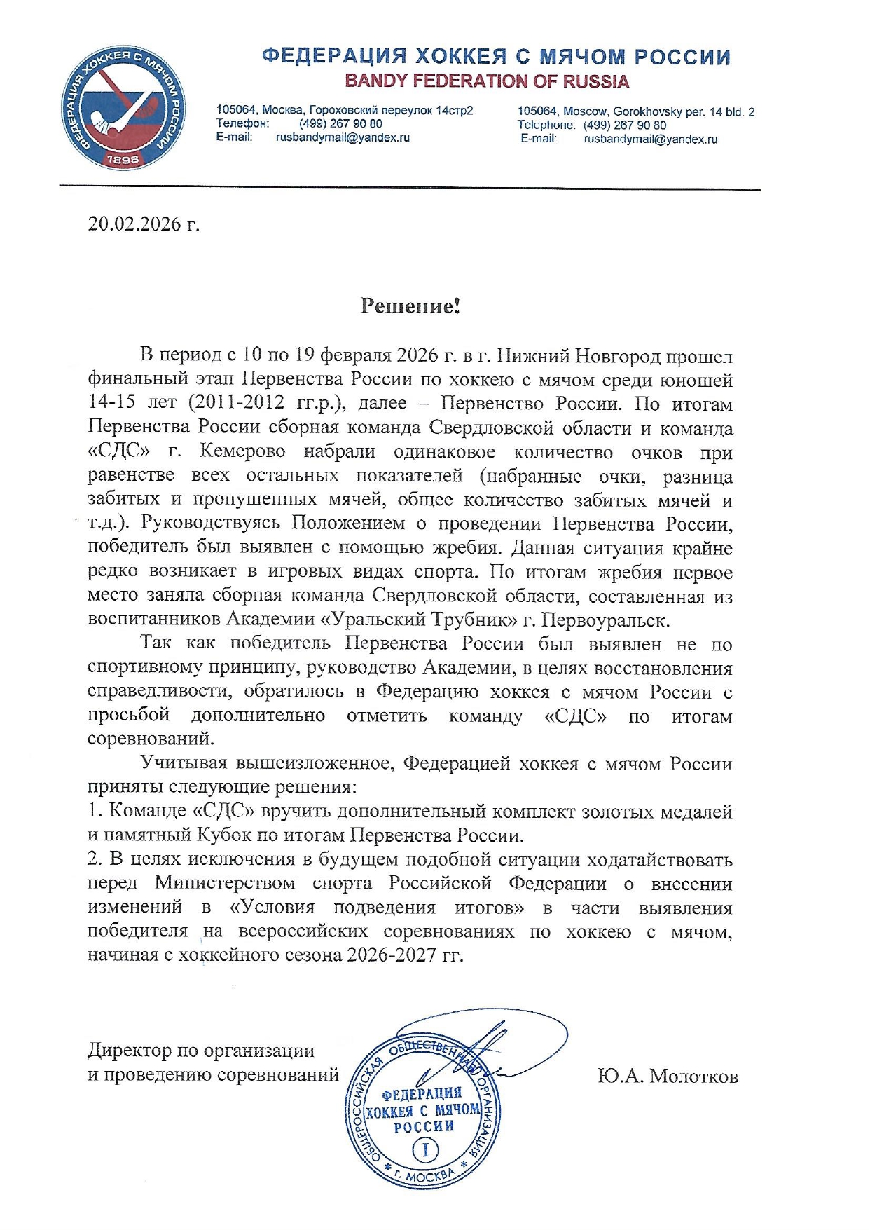 С 10 по 19 февраля 2026 года в Нижнем Новгороде прошел финальный этап Первенства России по хоккею с мячом среди юношей 14−15 лет (2011−2012 годов рождения).
