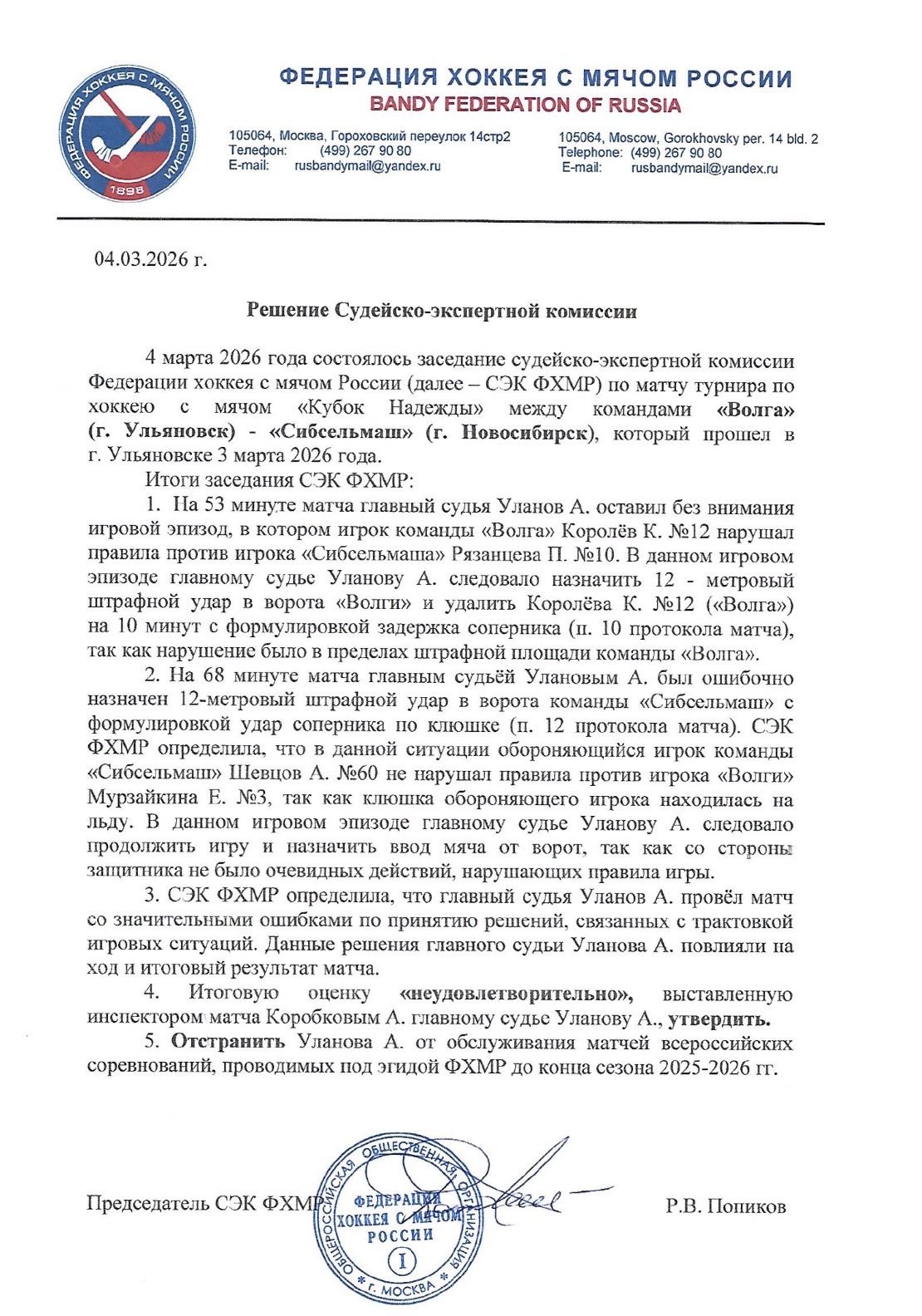 4 марта СЭК рассмотрела матч между «Волгой» и «Сибсельмашем», состоявшийся накануне в Ульяновске в рамках «Кубка Надежды».