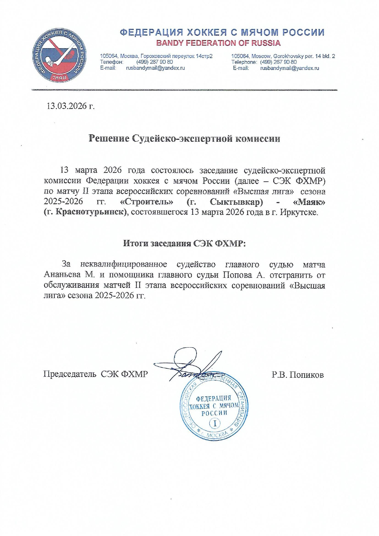 Ананьев и Попов отстранены от финала Высшей лиги
