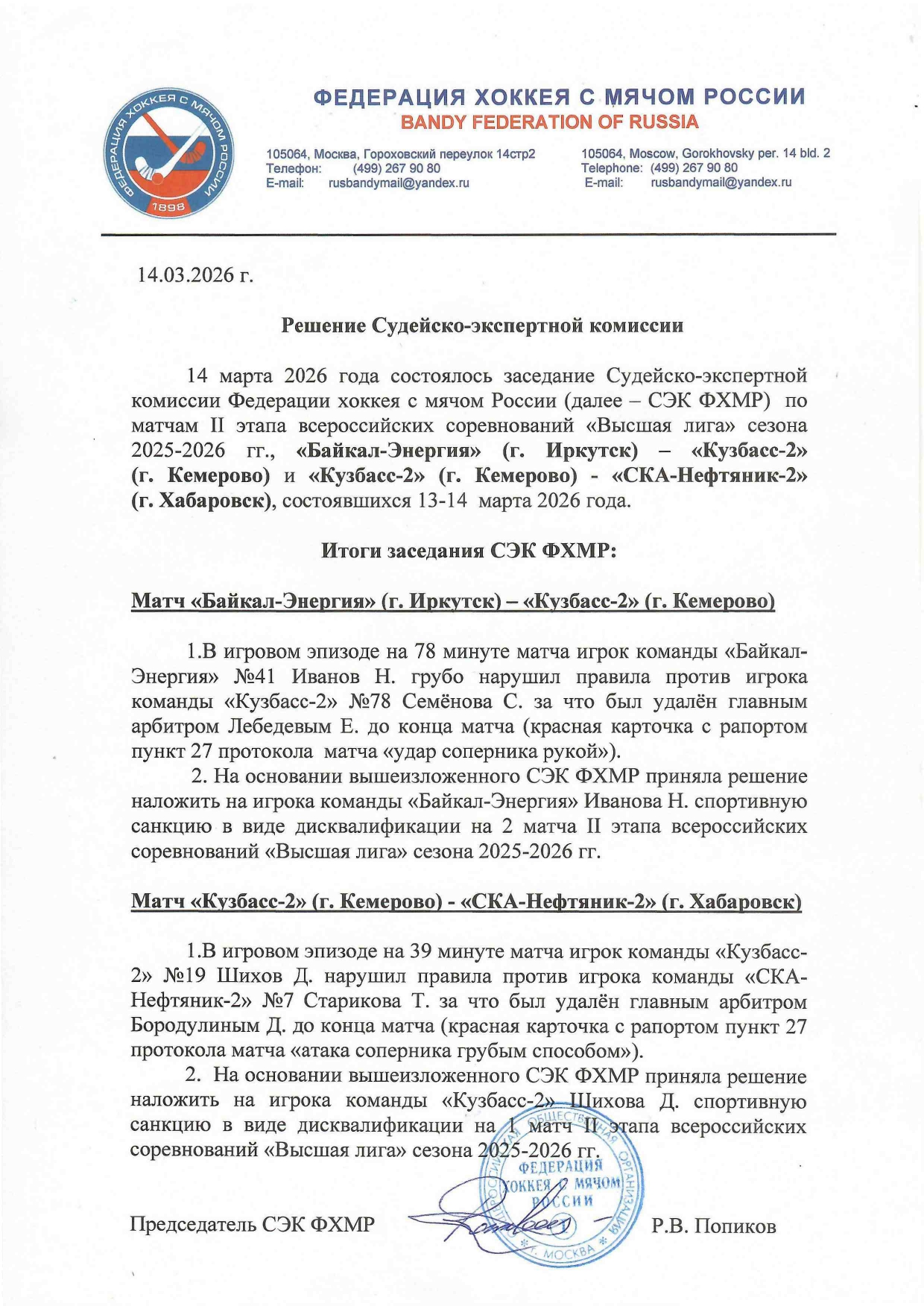 Ананьев и Попов отстранены от финала Высшей лиги