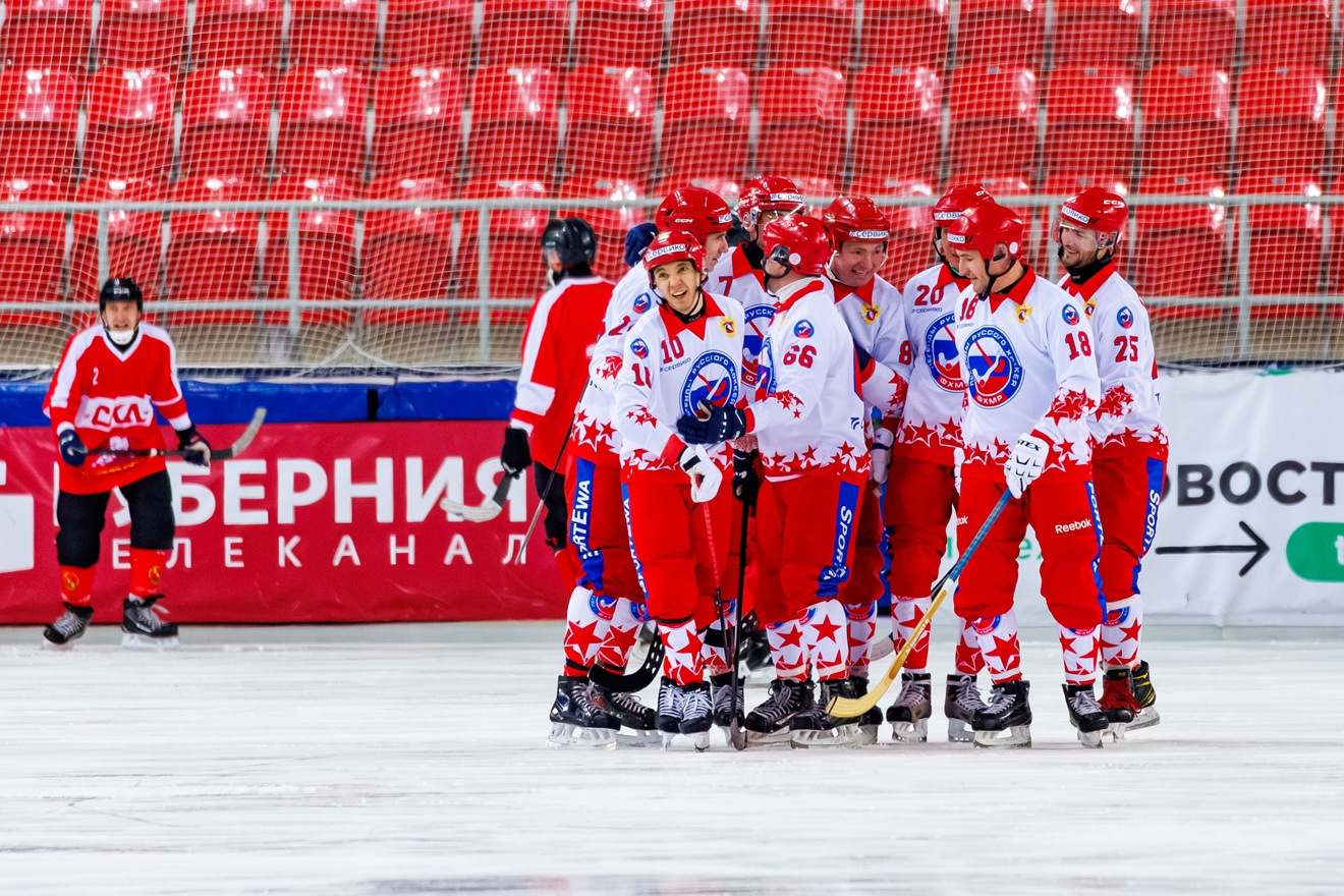 На лед вышли ветераны хабаровского хоккея с мячом, в гости к которым прилетели «Легенды русского хоккея». Состав «легенд» поистине легендарный — 7-кратный чемпион мира Евгений Иванушкин, в декабре занявший пост первого вице-президента ФХМР, а также его многолетние партнеры по сборной.